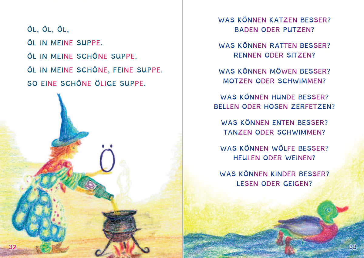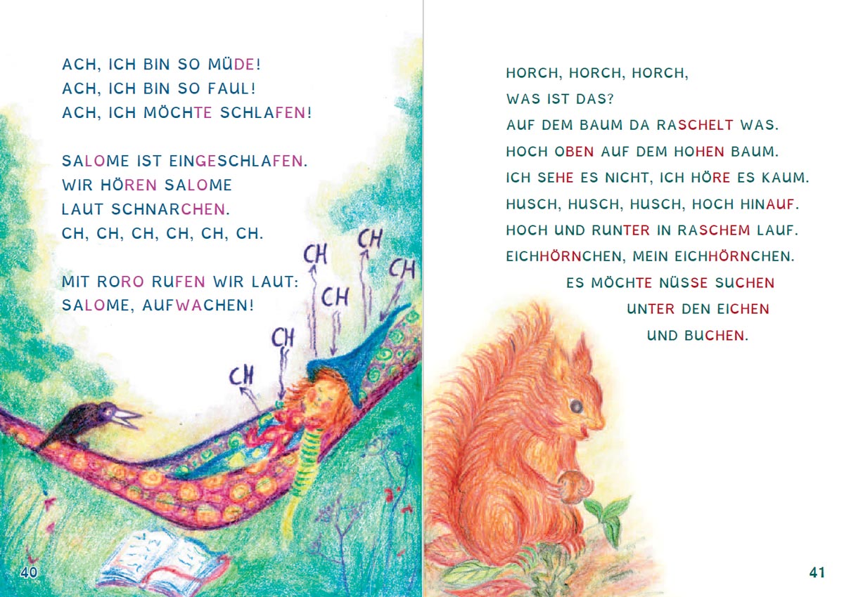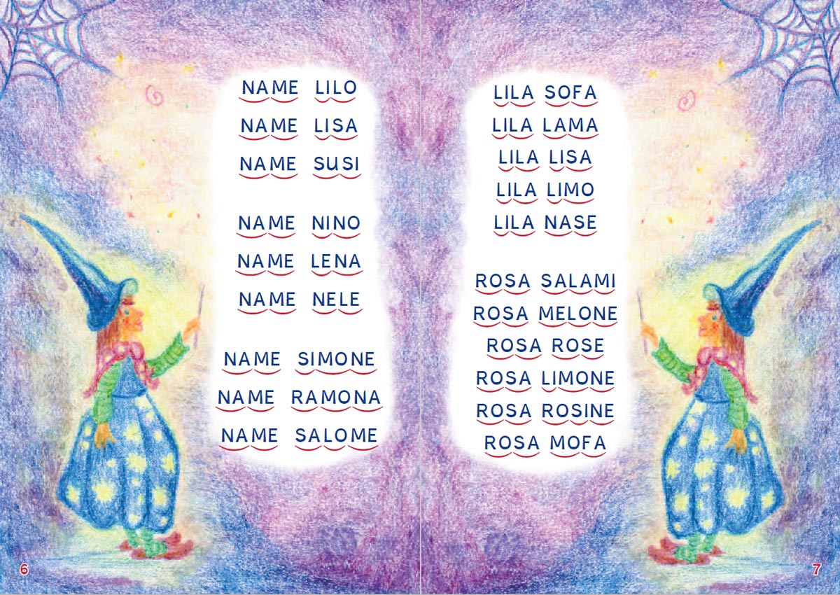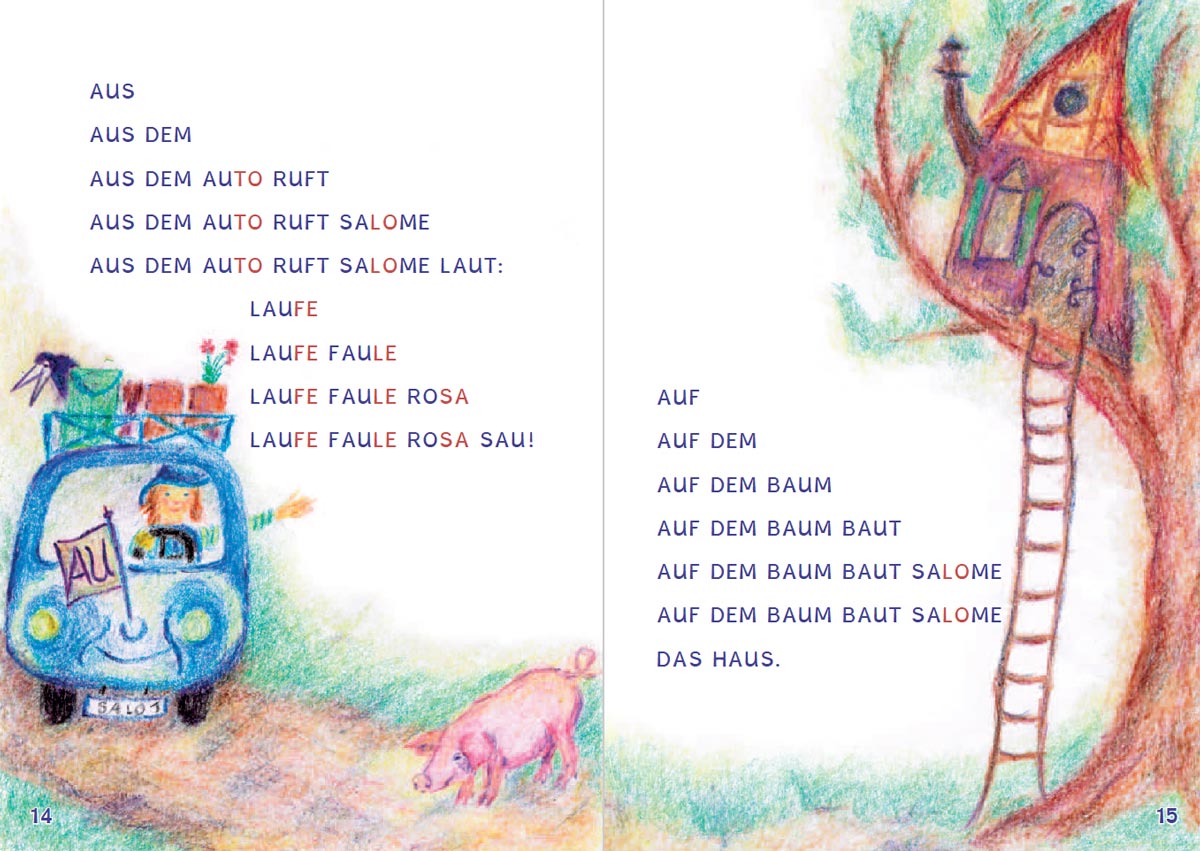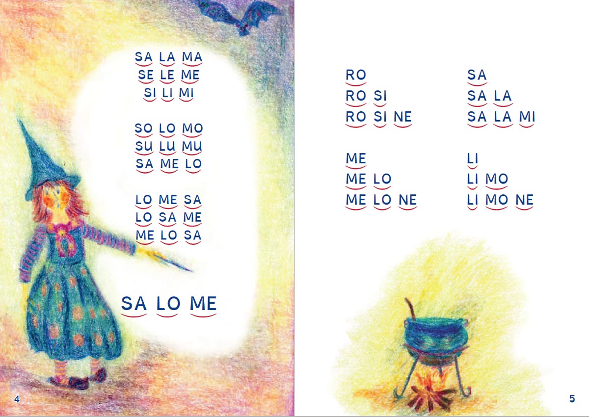 Gemeinsam mit Hexe Salome lernen die Kinder Buchstaben zu Silben und Silben zu Wörtern zu verschmelzen und werden dabei spielerisch in die grundlegende Lesestrategie eingeführt. Im Verlauf des Buches begegnen die Kinder vielen liebenswerten Tieren, bei deren Beschreibung sich die Wort- und Textstruktur zunehmend steigert.